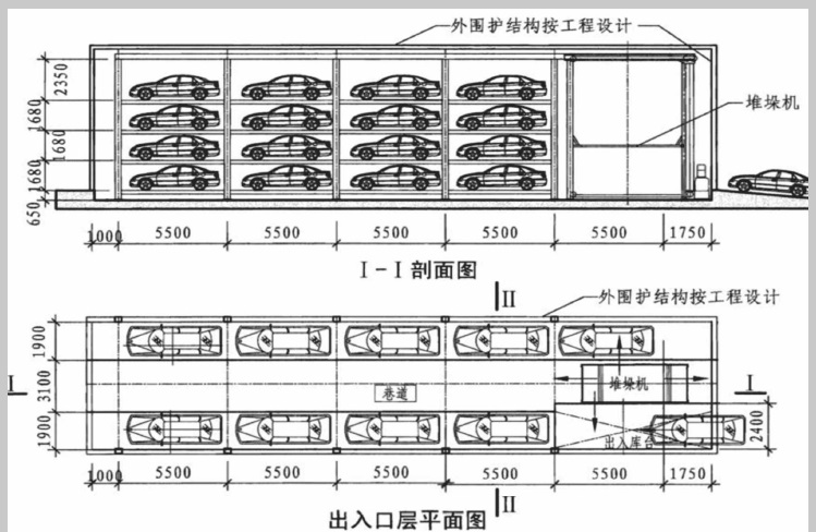 在兩側泊車位中央設有巷道堆垛,整個車庫的運行均由堆垛機完成。汽車入庫時,車輛停在出入庫臺上,堆垛機從出入庫臺上取走汽車后在巷道內行走并提升,將汽車運動到指定層的泊位旁,堆垛機上的存取機構將汽車從堆垛機送入人泊位,取車出庫過程與入庫過程相反。